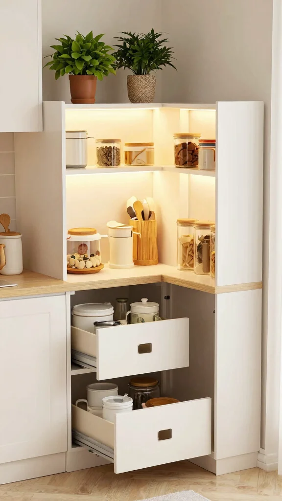 Consider adding a compact corner pantry for storing bulk items or appliances that you rarely use.