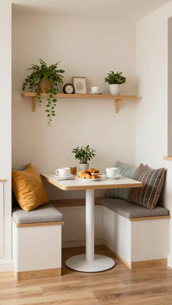 Using benches against the wall is a smart, space-saving solution, and adding cushions can make the area inviting. Use wall space above the nook for shelves or artwork to enhance the cozy ambiance.