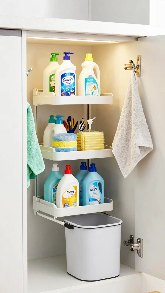 The space under your sink can be a storage goldmine if utilized effectively. By installing tiered organizers and using clear bins, you can maximize vertical space and keep cleaning supplies, pots, and pans easily accessible. Adding hooks to the inside of cabinet doors is a smart way to hang dish towels or cleaning tools, keeping everything tidy.