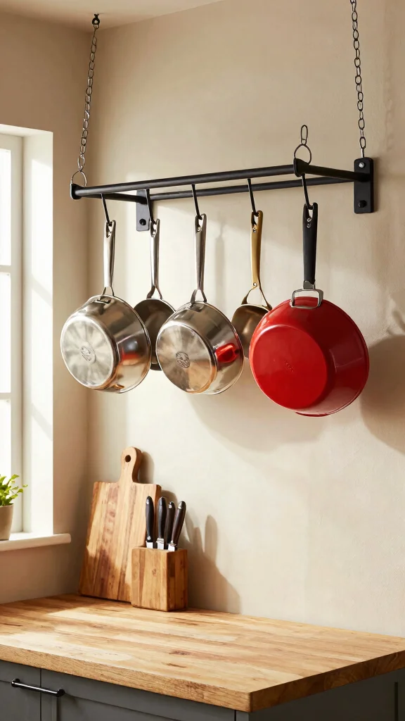 Hanging pot racks are an excellent way to save space while adding a decorative element to your kitchen. By suspending pots and pans from the ceiling or walls, you free up cabinet space for other essentials, creating a visually appealing focal point that enhances your cooking area.