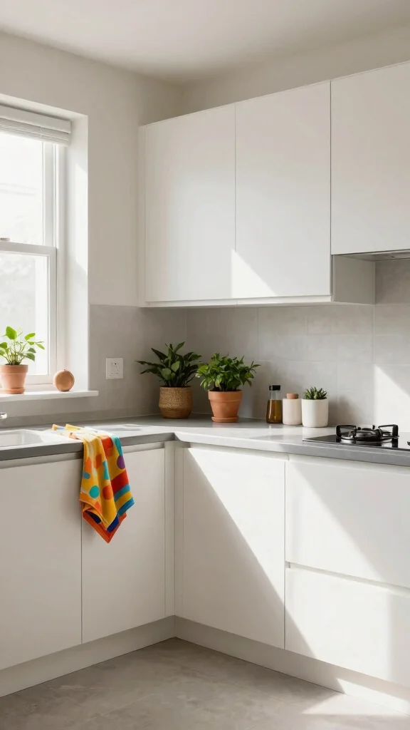 Incorporate vibrant dish towels, lush plants, or unique artwork to add character while maintaining a serene atmosphere. This balance between a neutral base and pops of color ensures your kitchen remains stylish and inviting.