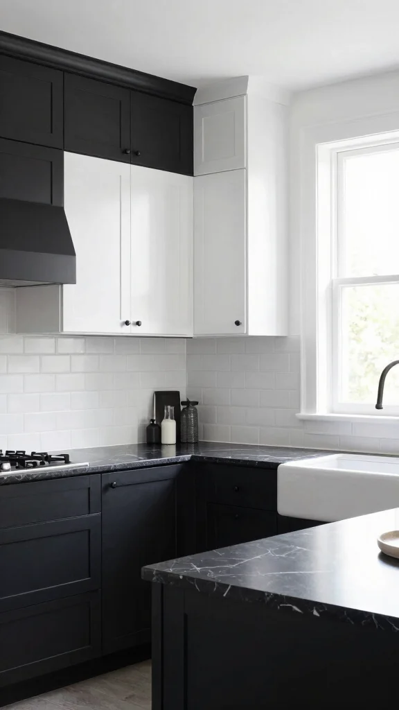 This combination creates a sophisticated kitchen environment, where the interplay of light and dark enhances the overall aesthetic.