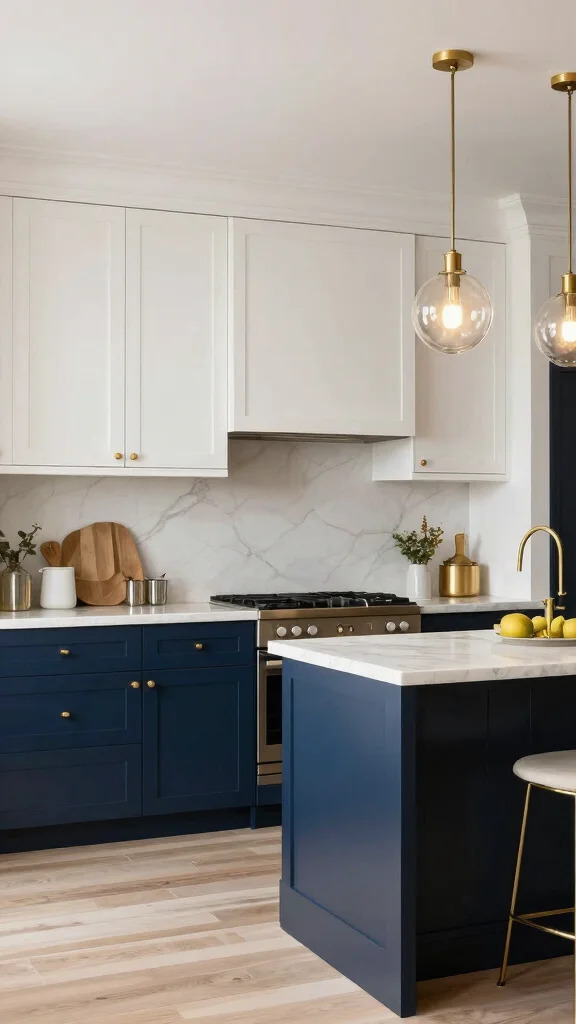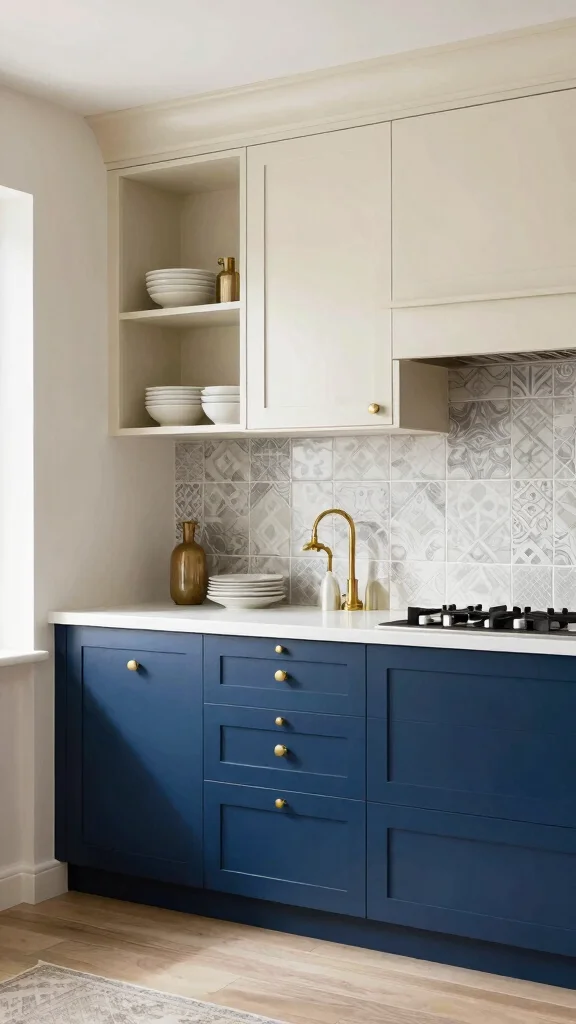 If you’re looking to make a statement in your kitchen, consider deep blue lower cabinets paired with soft cream upper cabinets. This striking combination offers a beautiful balance between boldness and warmth, suitable for various decor styles. The deep blue serves as a rich foundation while the cream introduces light and airiness, creating a welcoming atmosphere. To elevate this look, consider adding brass fixtures and a patterned backsplash that harmonizes with the color pairing, making your kitchen truly unique.