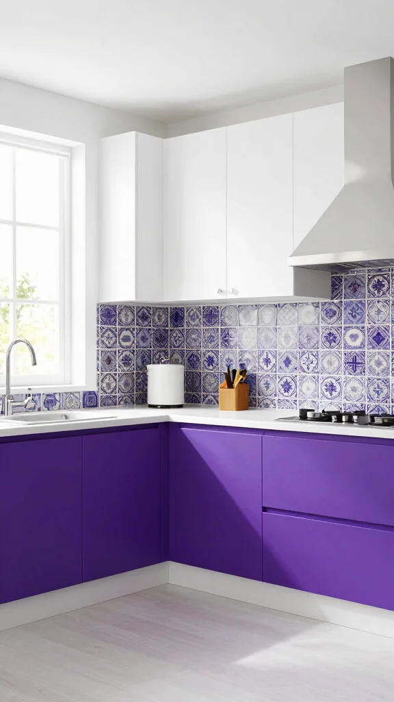 Using bright white as a base for your kitchen cabinets opens up endless possibilities for bold accents and accessories. This approach allows you to introduce striking colors or patterns in the lower cabinets or through decor while maintaining a fresh and clean look. White upper cabinets create an airy feel, while colorful lower cabinets can make a statement with tones like deep purple or vibrant red. You can also introduce patterns with unique cabinet designs or decorative tiles to add an interesting focal point to your space.
