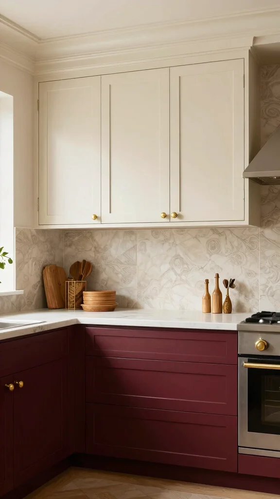 Combining rich burgundy with soft cream creates an inviting kitchen atmosphere that feels both luxurious and classic. This color pairing works beautifully in traditional and contemporary settings alike. Using soft cream for the upper cabinets brings lightness to the design, while burgundy lower cabinets provide a bold anchor that grounds the space. To enhance the warmth of this combination, consider adding decorative elements like brass fixtures or rich wood accents that elevate the overall aesthetic.