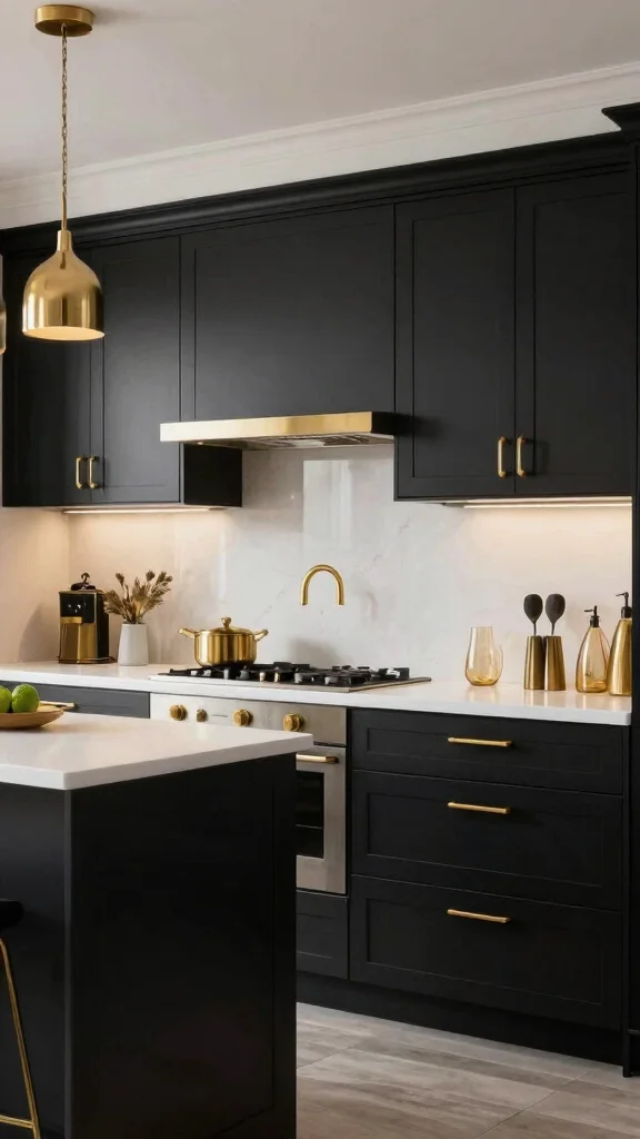 For a truly glamorous kitchen, the combination of black and gold creates a stunningly chic aesthetic. Using black cabinets paired with gold accents gives your kitchen a sophisticated, luxurious feel that’s perfect for entertaining. Consider black lower cabinets paired with gold hardware and a white or marble countertop to create a striking contrast. This design choice shines particularly well in larger kitchens, allowing bold colors to take center stage.