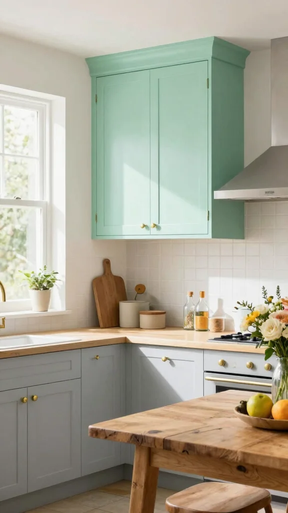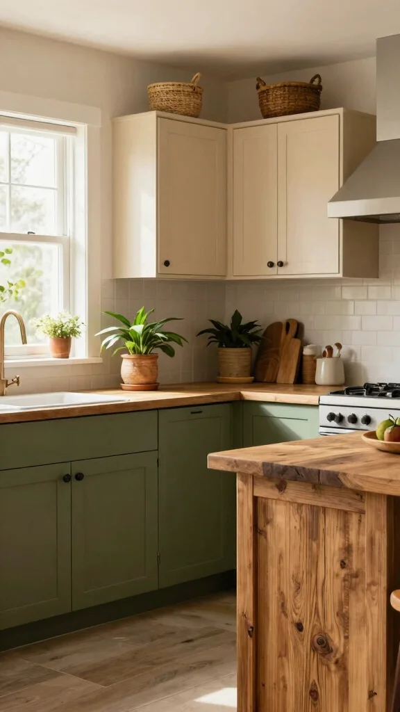 Soft green cabinets evoke a sense of tranquility, making them a lovely choice for kitchens focused on warmth and relaxation. Pairing soft green with natural wood creates a harmonious blend that feels both fresh and inviting. This setup works beautifully when using soft green for upper cabinets while keeping lower cabinets in a warm wood finish, establishing a sense of flow throughout the space. Complement this look with earthy decor items like basket storage or potted plants to enhance the organic feel of your kitchen.