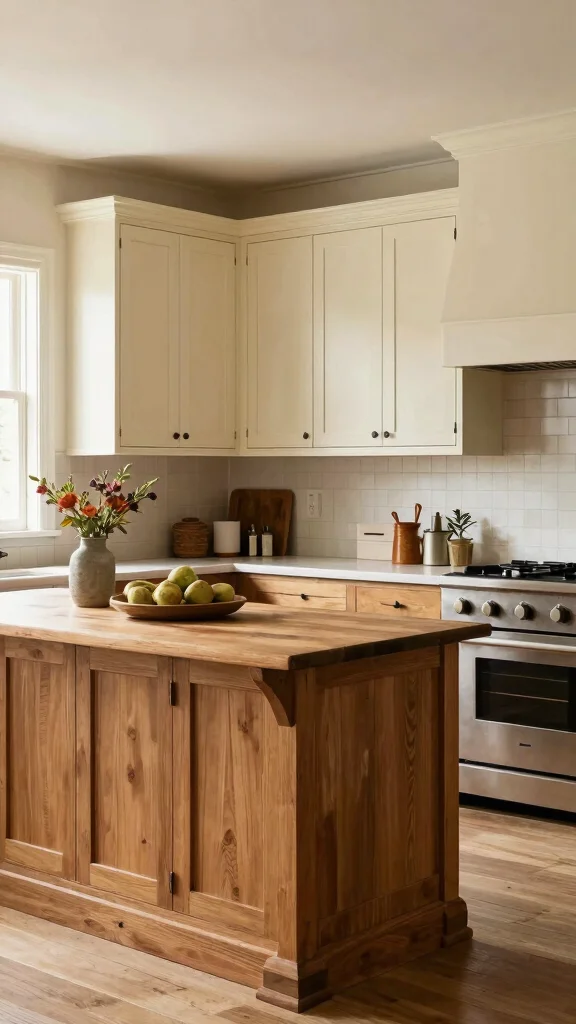 Mixing cream-colored cabinets with natural wood introduces a warm, rustic charm that is perfect for farmhouse-style kitchens. This combination works beautifully by using creamy upper cabinets paired with rich, warm wood tones below, creating a lovely contrast and infusing natural elements into your space. To enhance the rustic appeal, consider adding vintage fixtures and wooden accents that complement this cozy aesthetic. A wooden kitchen island can serve as a stunning focal point, tying the entire design together.