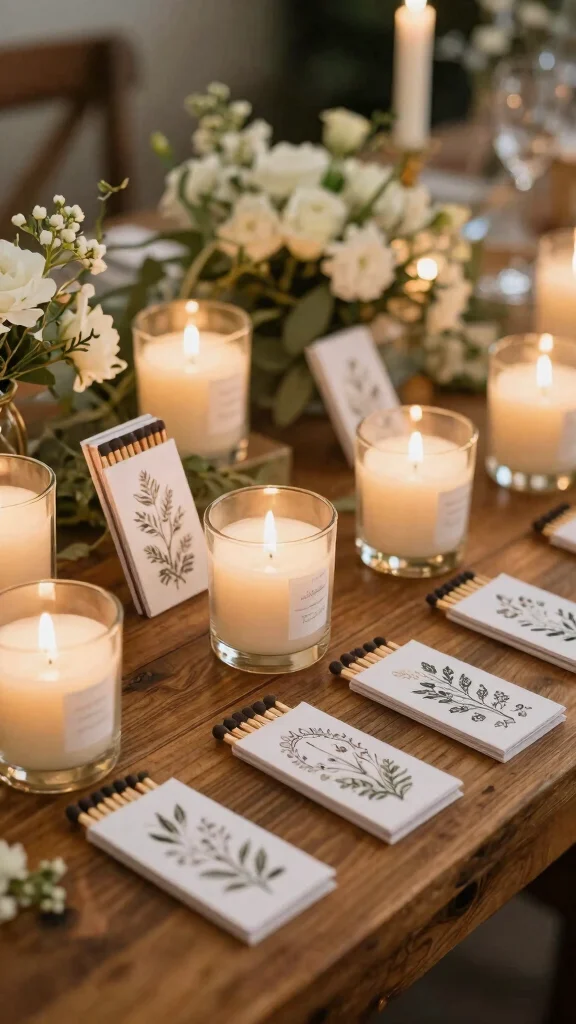 Combine scented candles with beautifully designed matchbooks for an interactive favor. Customize the matchbooks to reflect your wedding theme, incorporating graphics, colors, and your names for a personal touch. Guests will appreciate the thoughtful packaging that allows them to light the candle later.