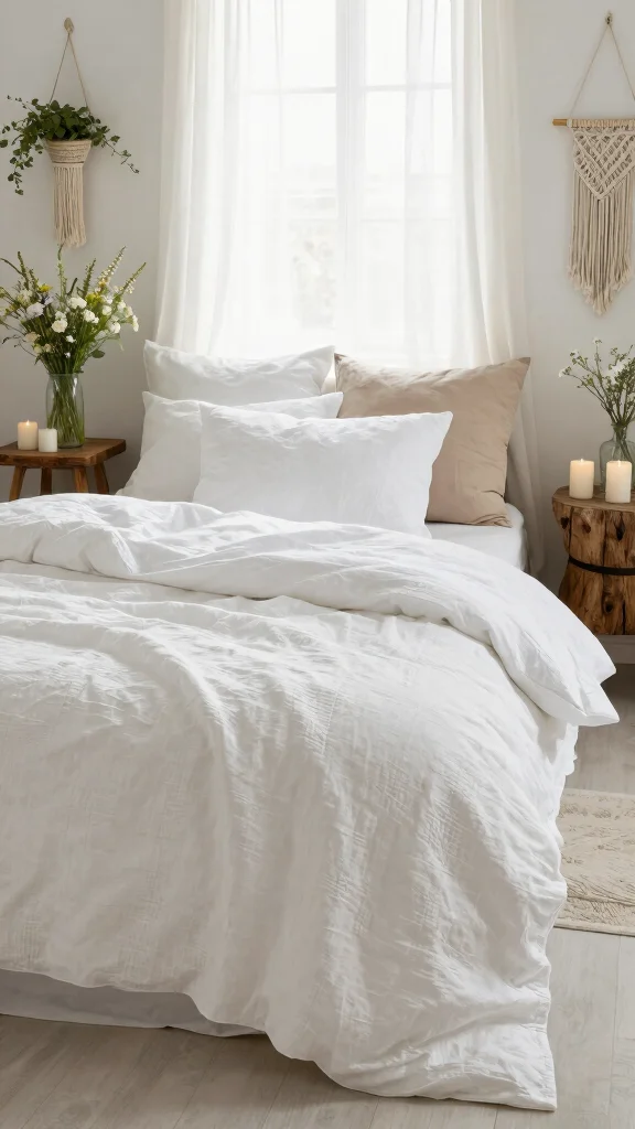 While the focus is on white, incorporating subtle patterns can enhance the bohemian feel. Look for bedding with soft, muted designs or woven textures that add depth without overwhelming the space. Mix white with natural wood tones or pastel shades for a warm and inviting look. This approach keeps your bedroom light while still adding visual interest.