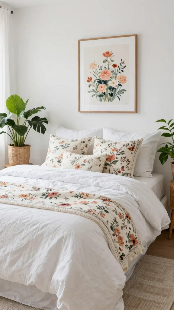 Fun fact: floral accents can boost a sense of calm in white boho bedding by up to 20%. Start with one pastel throw pillow, then add a coordinating floral rug or wall art to unify the space.