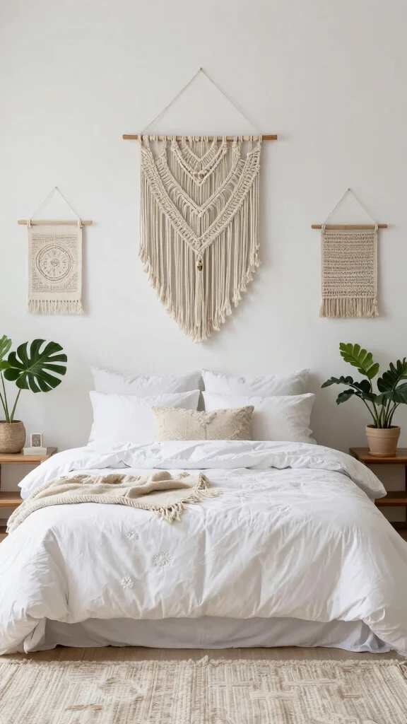 Transform your bedroom into a bohemian paradise by adding wall hangings that complement your white bedding.
