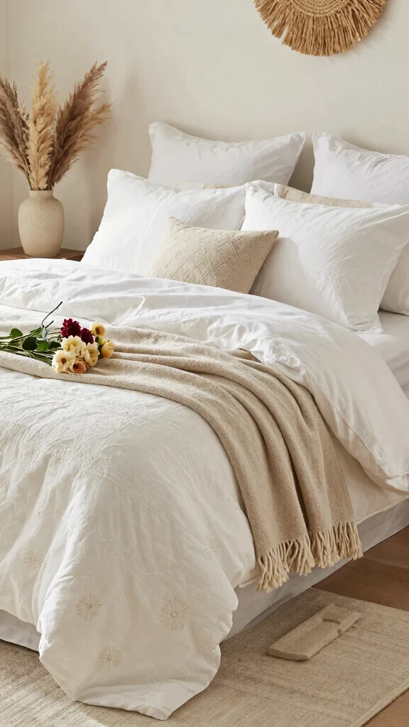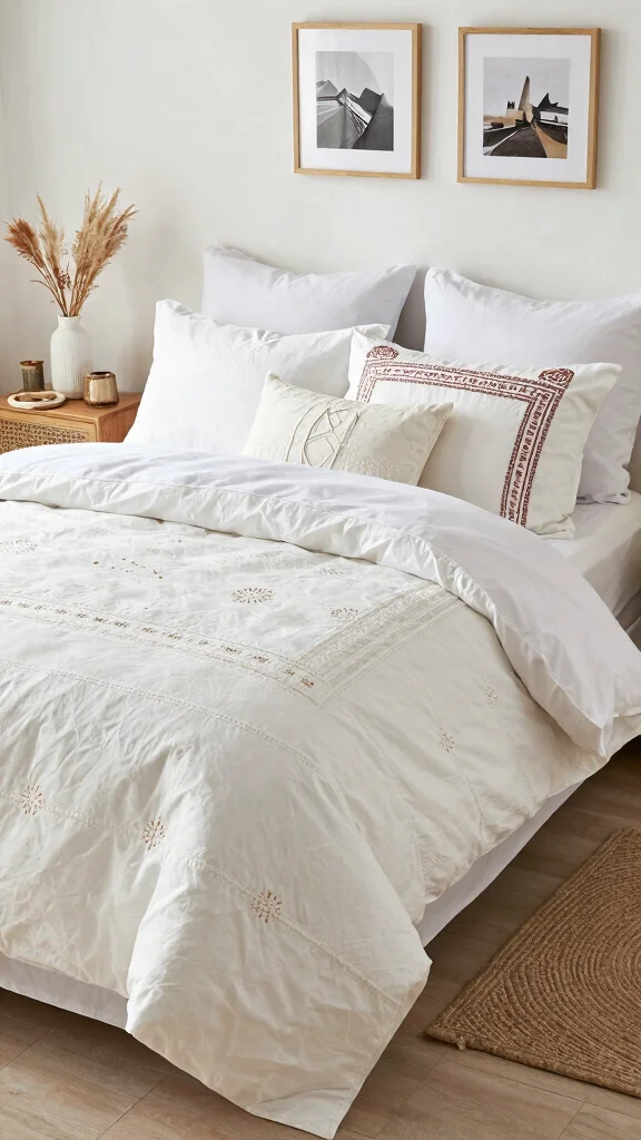Focus on white boho bedding that showcases unique designs or textures, making it stand out against a clean background. This could be a beautifully patterned duvet cover or an eye-catching throw that injects personality without overwhelming the space.