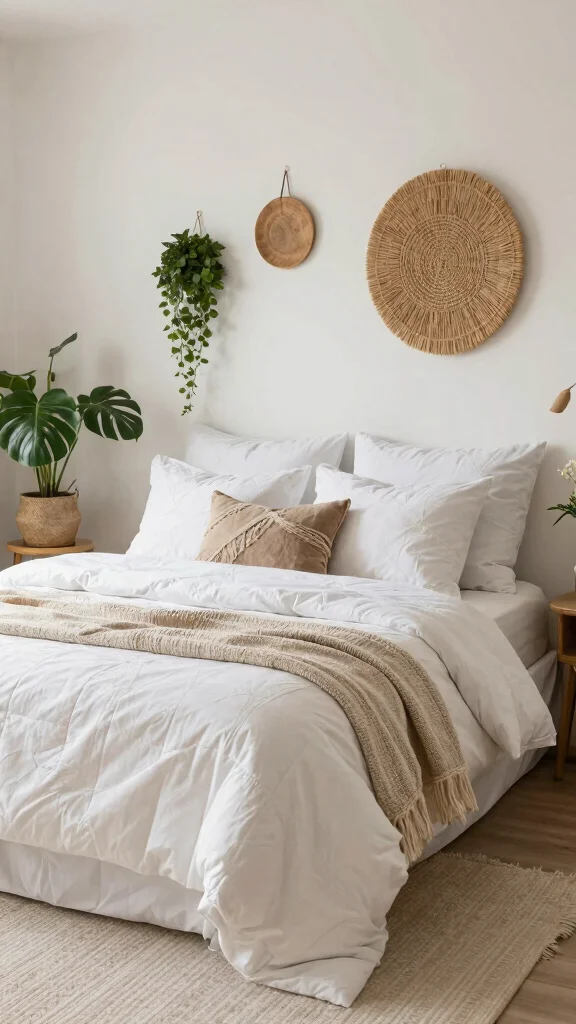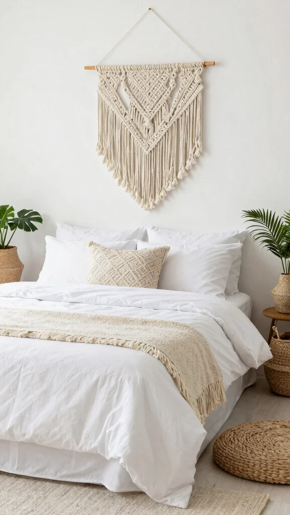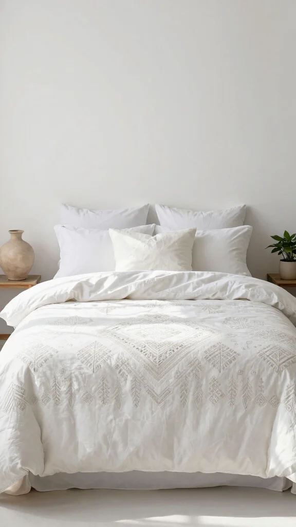 While white offers a calming base for your bedroom, incorporating subtle boho-inspired patterns can elevate your design.