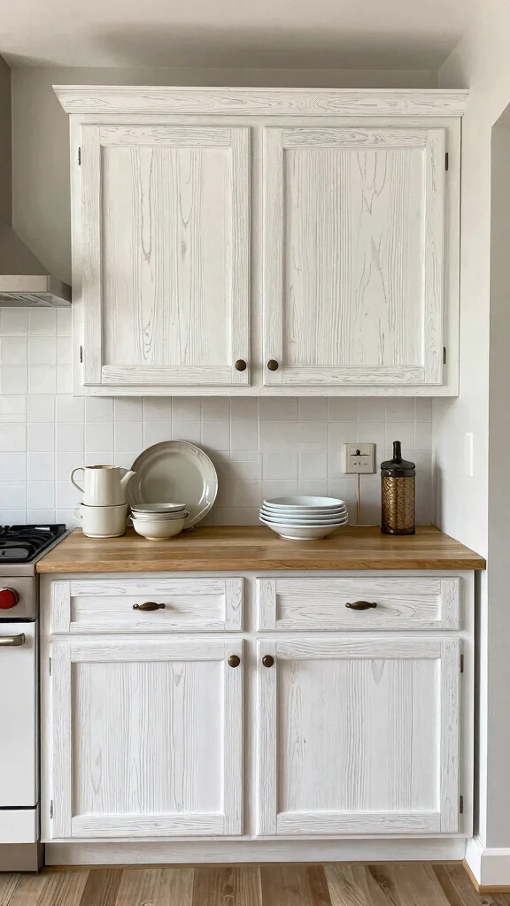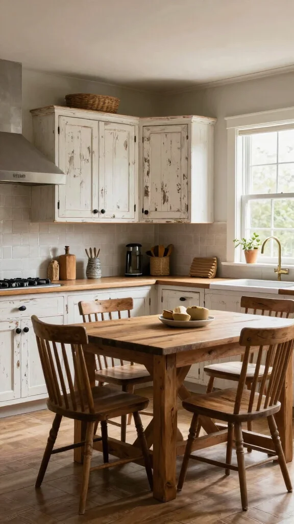 Step into a kitchen that exudes cozy charm with distressed white oak cabinets. Their weathered appearance adds a delightful rustic touch, connecting your culinary space to nature. This design is ideal for those who cherish farmhouse aesthetics, especially when accentuated with vintage decor and warm lighting. For a truly inviting atmosphere, consider creating a cozy dining nook that complements the rustic vibe.
