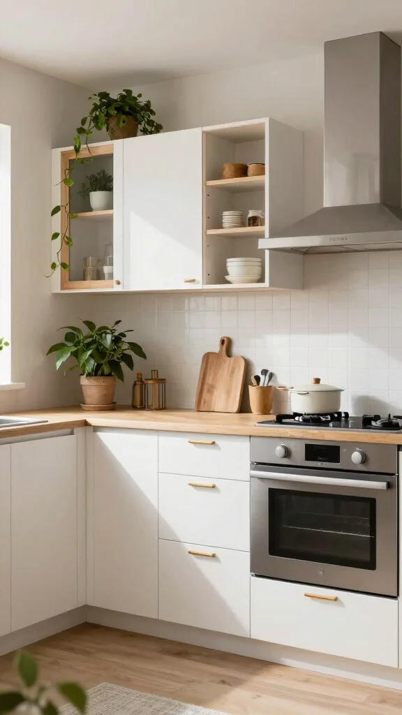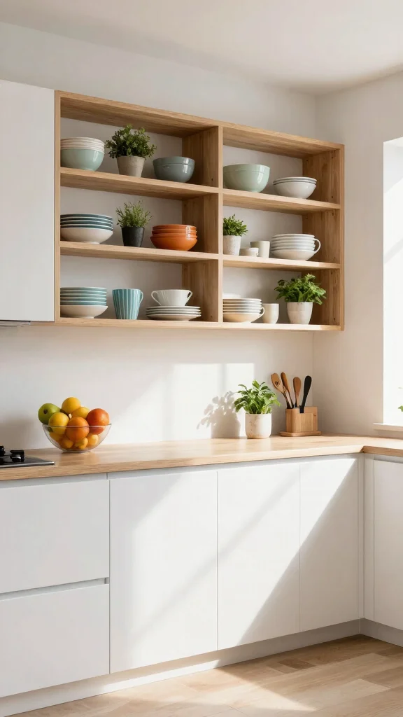 Open shelving offers multiple advantages, from easy access to frequently used items to showcasing personal decor that reflects your style. This design choice not only opens up the space but also encourages tidiness, as it invites you to keep your kitchen organized.