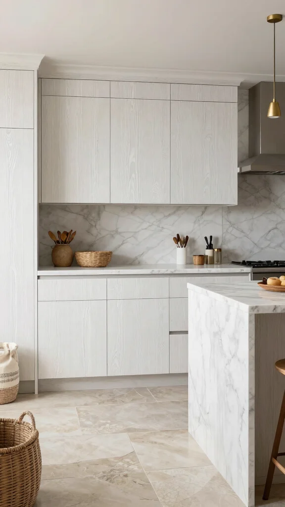 To create this textured look, pair your white oak cabinets with polished marble or granite countertops for a stunning contrast. Metal accents in lighting or bar stools introduce an industrial flair, while woven baskets or fabrics offer warmth. Introducing stone or ceramic tiles in your backsplash can further enrich the design.
