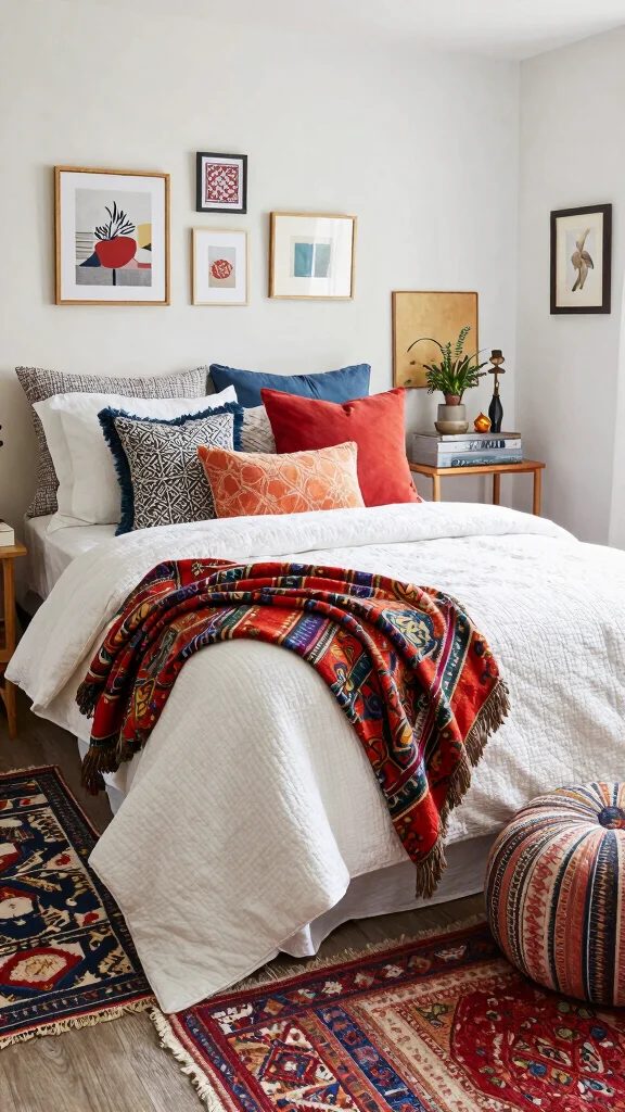 – Incorporating layered textiles like a bold printed duvet or vibrant macramé hanging.