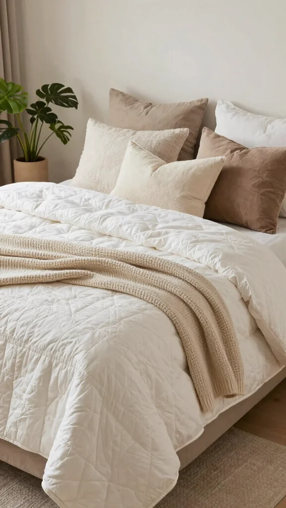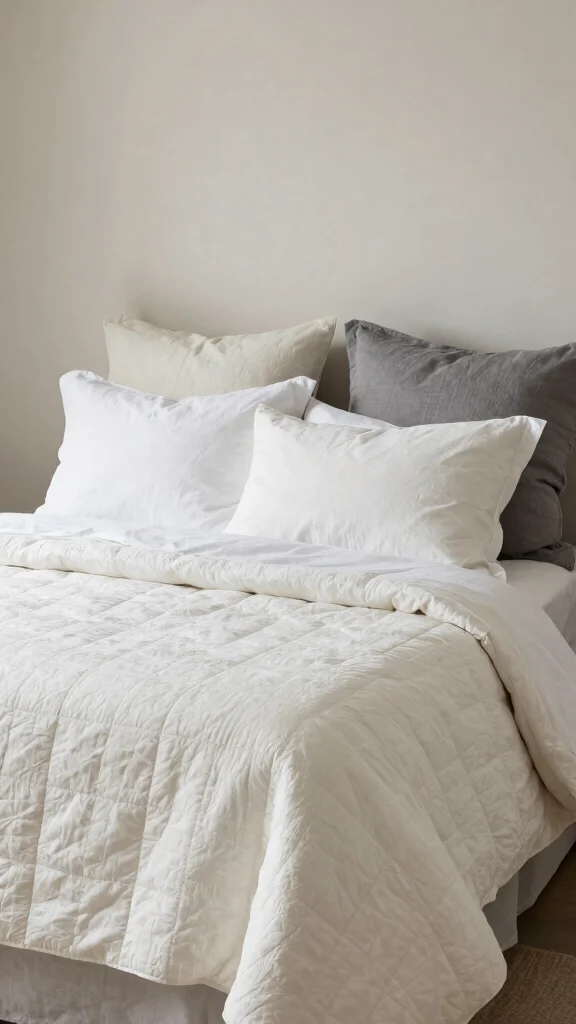 Introduce subtle differences in fabric finishes, such as contrasting a matte quilt with satin or silk accents. This nuanced layering adds depth while maintaining a clean aesthetic.