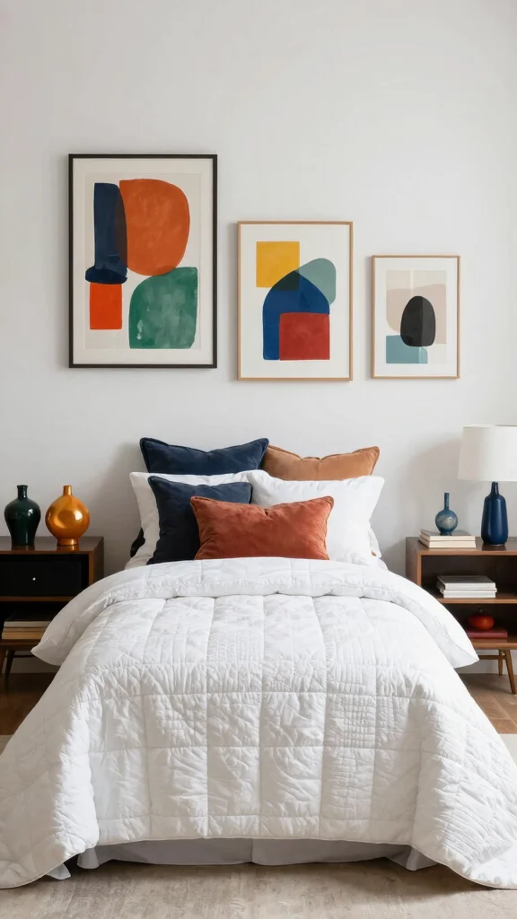 – Select framed art or prints that contrast with the white quilt for visual impact.
