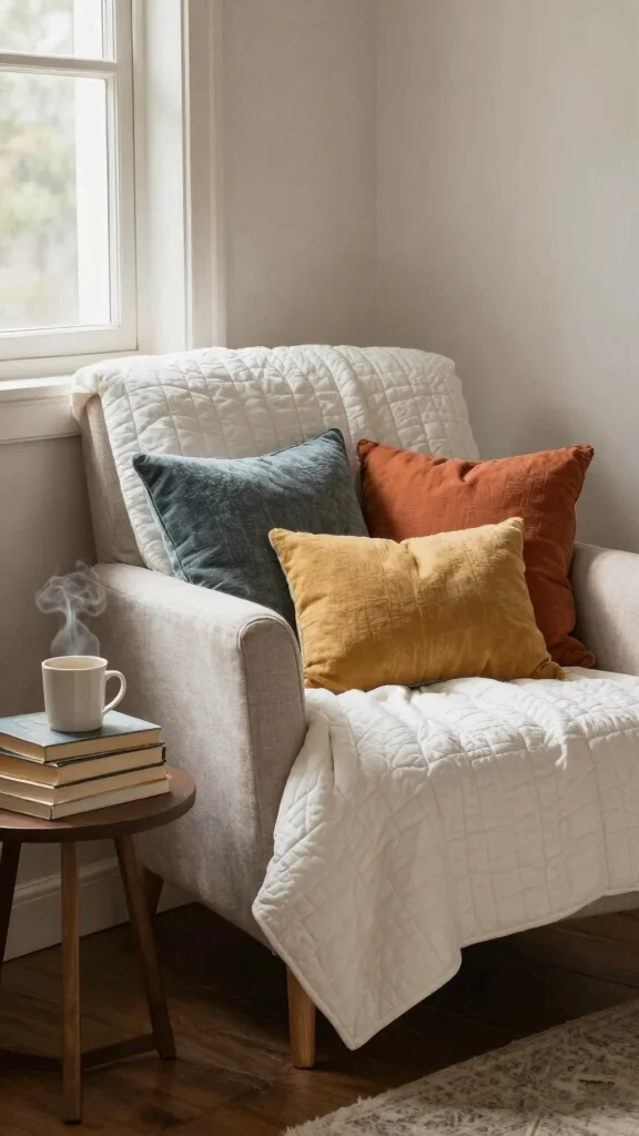 – Incorporate throws and pillows in muted hues like olive green or burnt orange for warmth.
