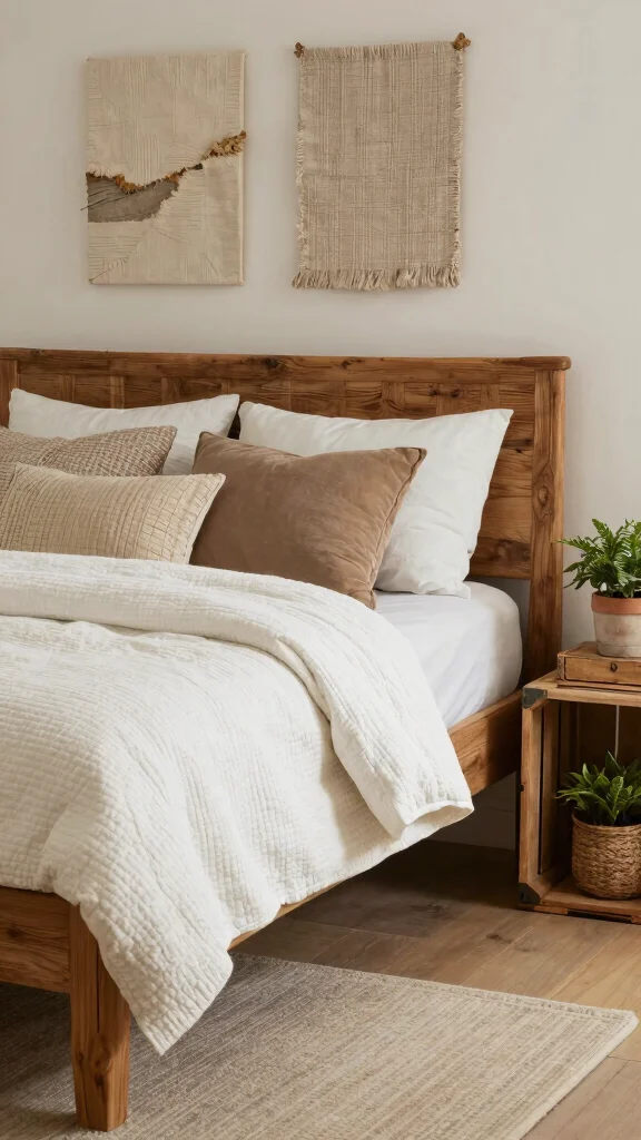 Accentuating your white quilt with natural elements creates a harmonious, inviting space. This combination fosters warmth and depth in your bedroom decor.