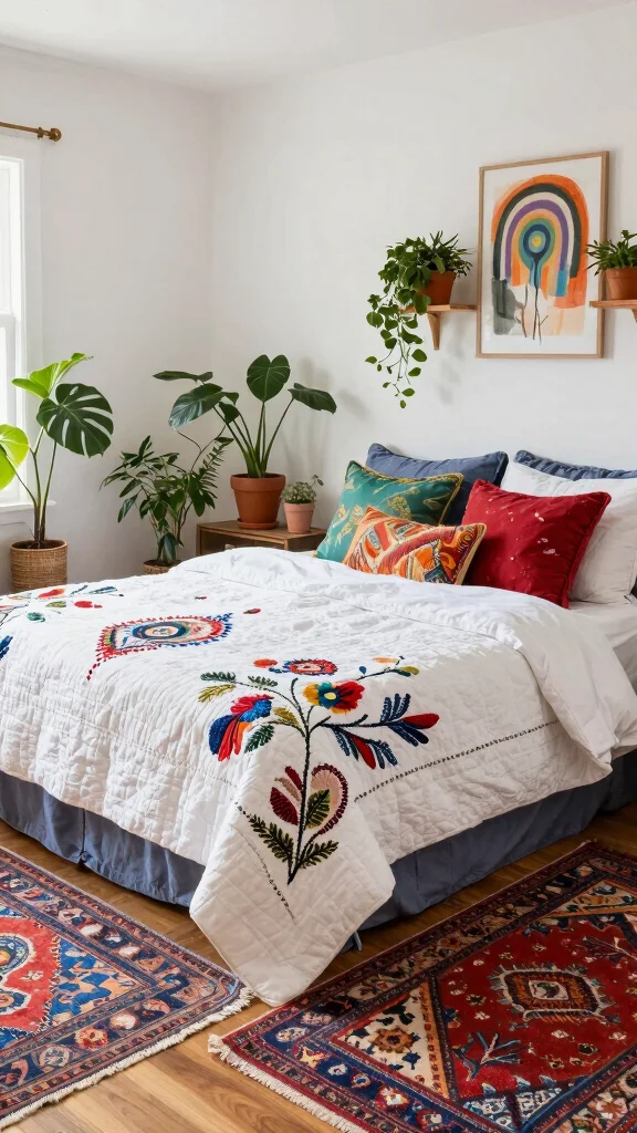 Infuse your bedroom with bohemian vibes by using a white quilt that features intricate patterns or embroidery. Pair it with colorful throw pillows and layered rugs to create a relaxed, eclectic atmosphere that feels inviting and free-spirited. The beauty of bohemian decor lies in its celebration of individuality, so don’t hesitate to mix and match diverse patterns.