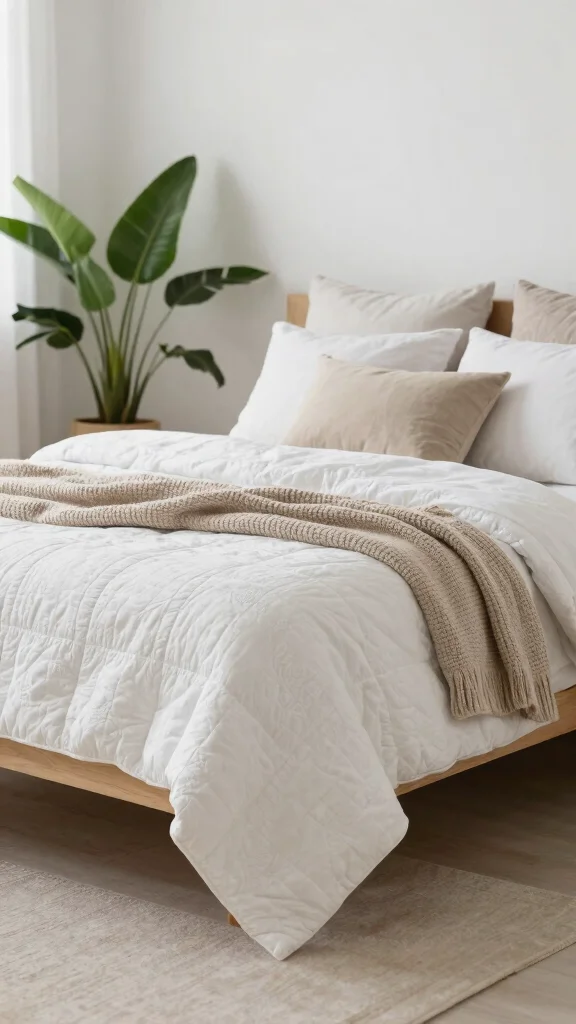 Choose a white quilt design with simple, breathable quilting and minimal bulk to preserve space. Look for tonal stitching or very light texture rather than heavy patterns so the room stays bright. Pair it with white walls or pale accents to maximize light and enhance cozy bedroom decor while staying true to timeless bedding styles. Finish with light-weight sheets and a single decorative throw to keep the space feeling expansive and calm, a true example of home textile inspiration in action.